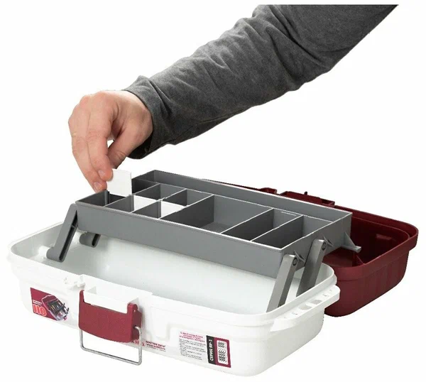 Размер 370*190*150 . Ящик ЯР-1 выполнен из высококачественного полипропилена, который удароустойчив, влагонепроницаем и устойчив к изменению температур, при этом материал не вступает в химическую реакцию с силиконовыми приманками, твистерами, что делает его незаменимым помощником в любом виде рыбалки. Вертикальная нагрузка на ящик в 125 кг позволяет использовать его в качестве сидения на рыбалке, не боясь за его целостность. Ручка ящика надежная, со специальными фиксаторами с двух сторон, которые исключают возможность прогиба ручки, при полной загрузке ящика снастями. Ящик закрывается на прочную защелку с металлической скобой, которая полностью исключает возможность самопроизвольного открытия, а металлические оси обеспечивают надежность крепления и долговечность использования данной модели ящика. При открытии крышка ящика служит опорой, 1 лоток выдвигается вертикально с помощью крепких рычагов: Лоток оснащен съемными перегородками, с помощью которых можно создавать ячейки нужных размеров под определенные снасти. Нижний лоток достаточно глубокий: в него можно поместить личные вещи либо инструмент, эхолот, фонарик, катушки с запасными шпулями. Ящик эргономичен, удобен для переноски, компактные размеры позволяют его использовать и в ходовой, и в лодочной ловле, в домашних условиях он подходит для хранения и комплектации инструментов, запчастей.Дополнительно
