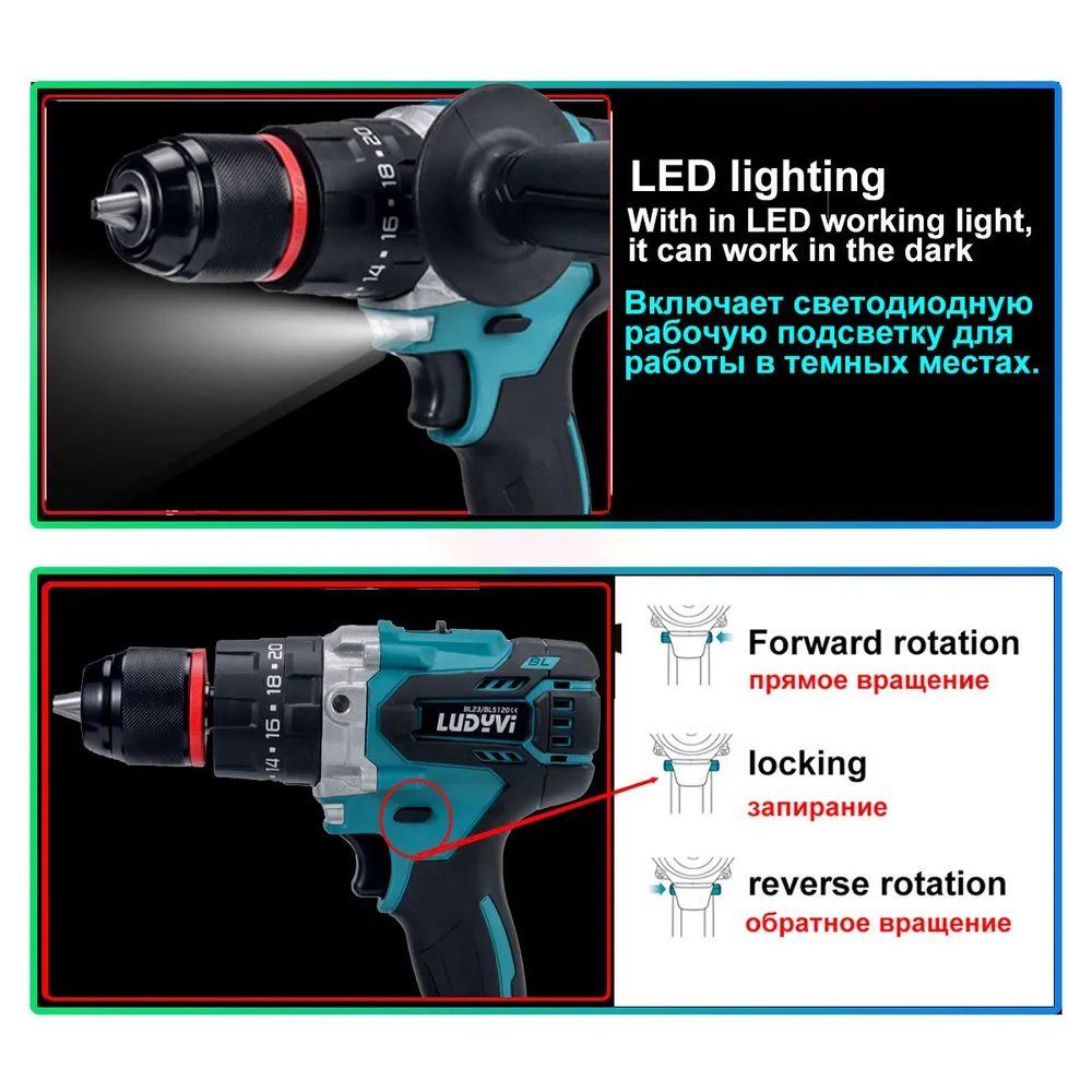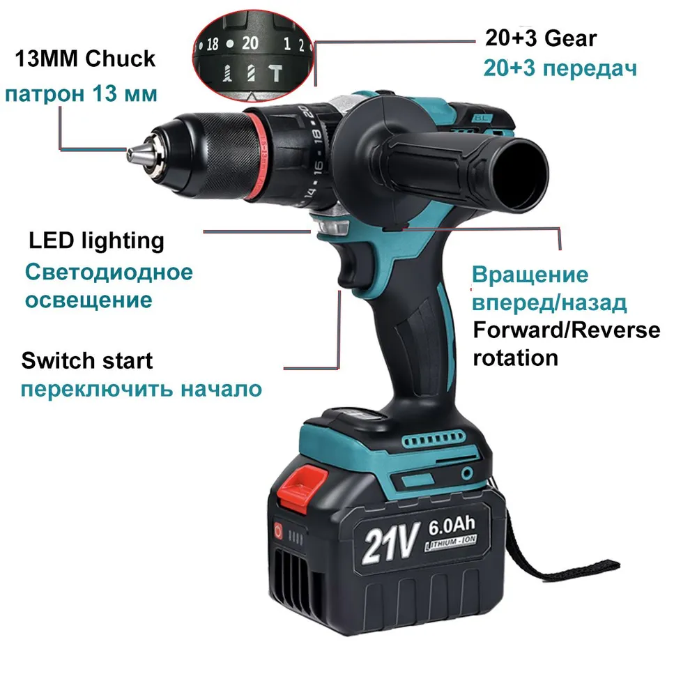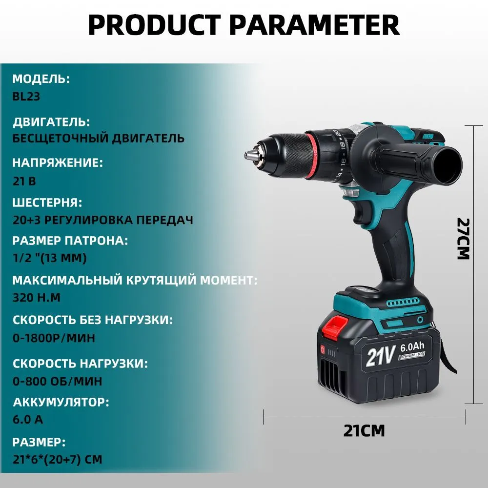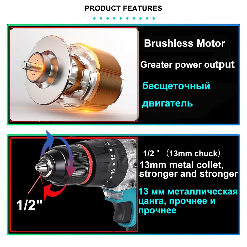 Тип электродрели: бесщеточный двигатель, более длительный срок службы и больший крутящий момент.