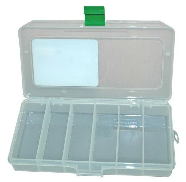 Небольшая, удобная коробка с шестью отделениями, разрабатывалась для использования в разгрузочных рыболовных жилетах. Коробка надёжно закрывается с помощью одной стандартной сменной защёлки. Для защиты замка и избежания зацепов при вытаскивании коробки, предусмотрены специальные треугольные отливы.Характеристики