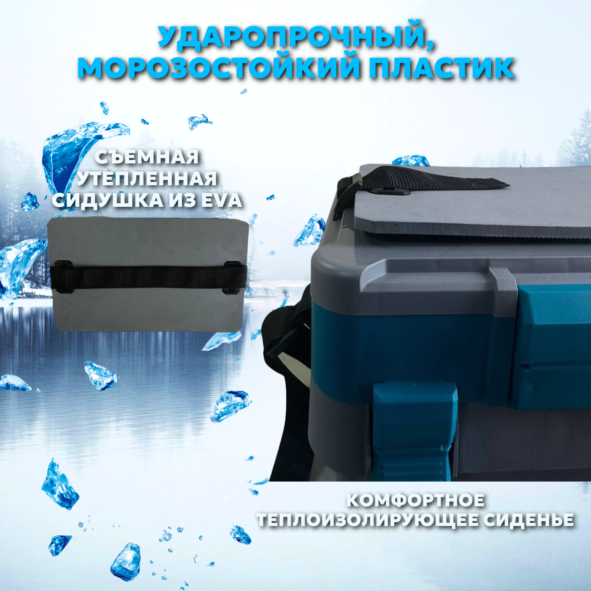 Съёмное утеплённое сиденье из EVA на ремне с пластмассовыми люверсами обеспечивает комфортное место для отдыха во время рыбалки.