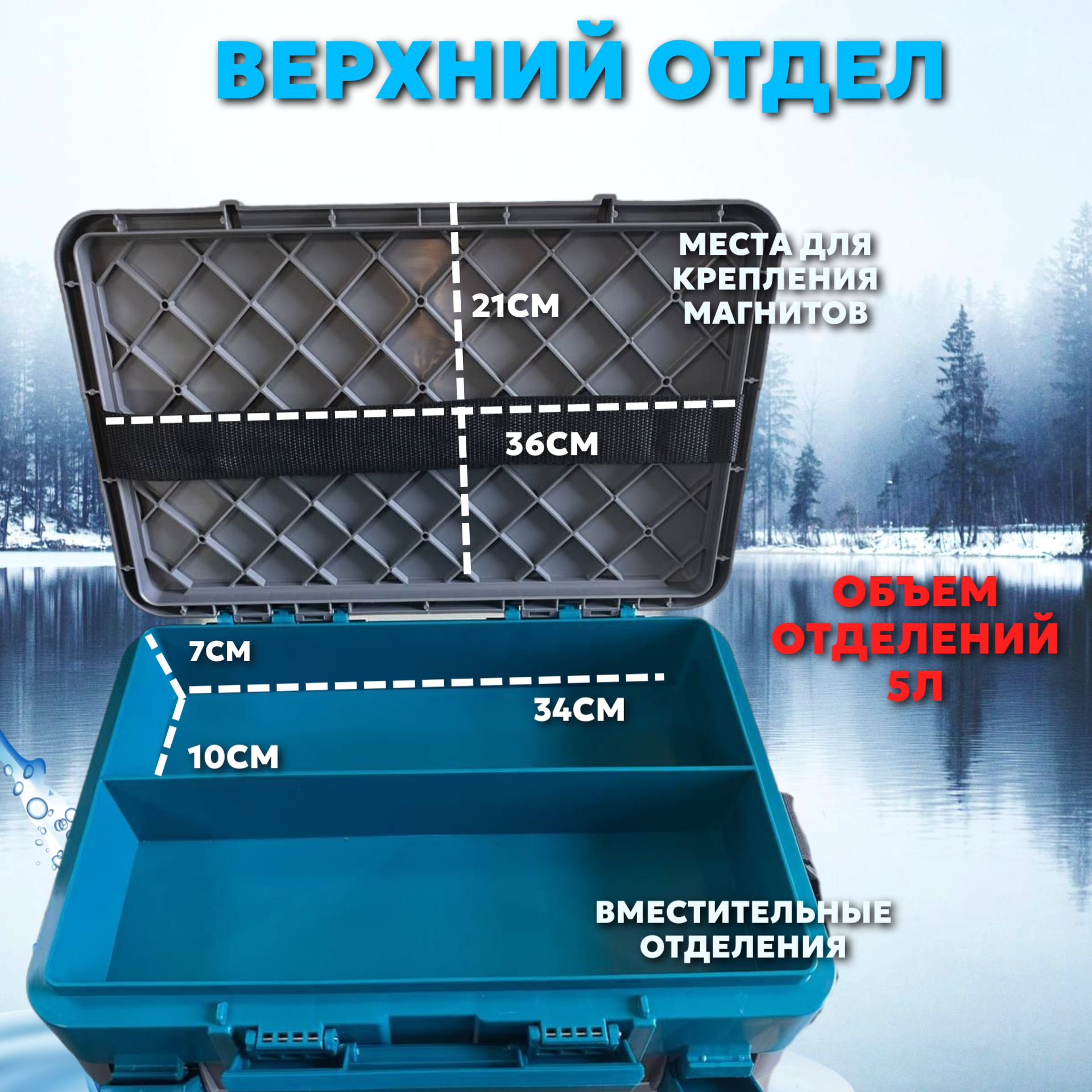 Средняя крышка ящика глубокая и разделена на два отделения, которые идеально подходят для хранения малых рыболовных коробок FISH'KA до 8 штук, багориков, весов, щипцов и других необходимых предметов.