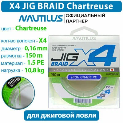 X4 Jig braid - большая линейка качественных, современных шнуров Nautilus. Изготовлены методом 4-х жильного плетения из PE волокон, повышенной прочности. Шнур обладает очень высокой абразивоустойчивостью и самой минимальной растяжимостью.